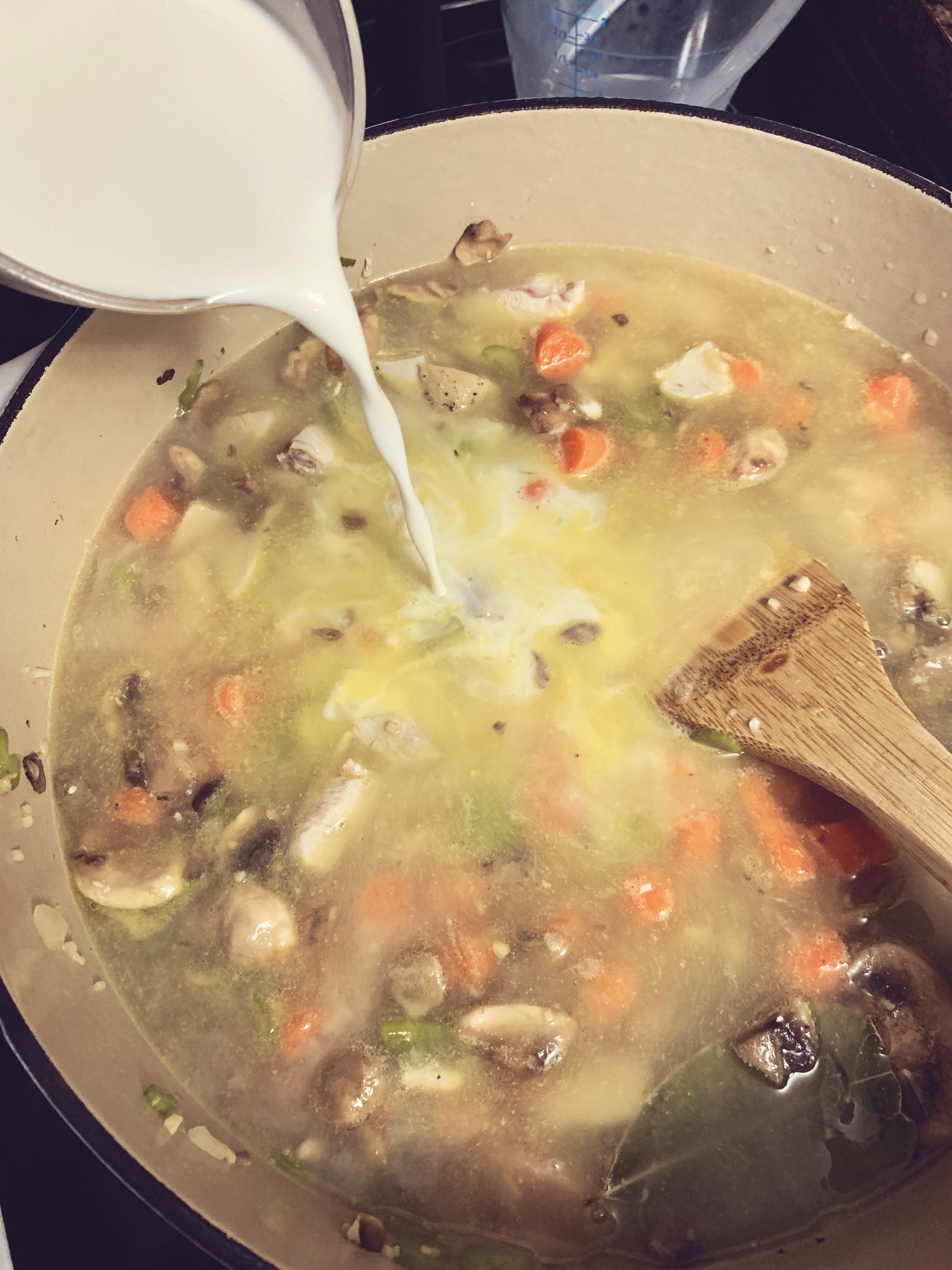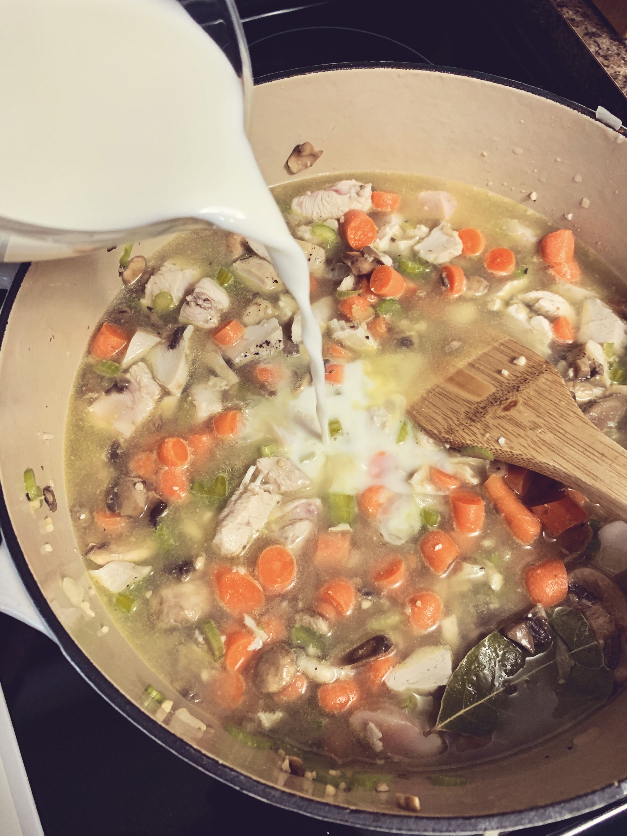 Step 4 - Pour in you chicken stock, cream and milk. Stir well. Allow the pot to come to a mild simmer. Remove part of your liquid to a small mixing bowl. To the small bowl, add your flour, whisking constantly. If it is "gloppy", add a bit more liquid, whisking until it has a very loose paste consistency. Add this back to the pot and stir well to combine.