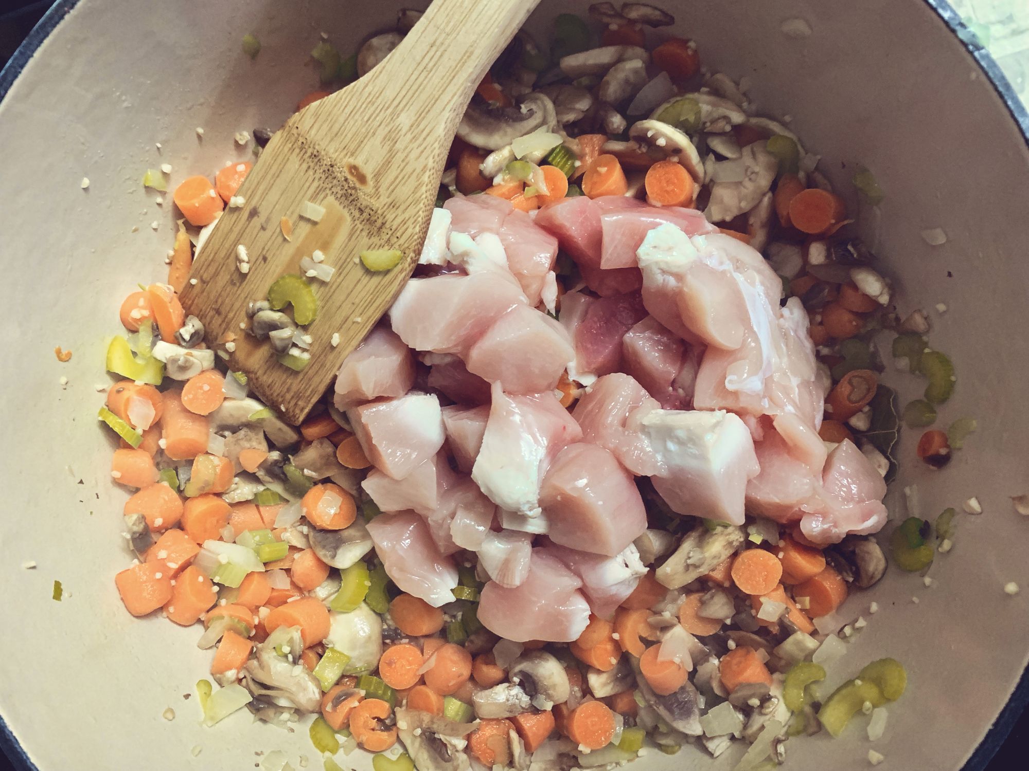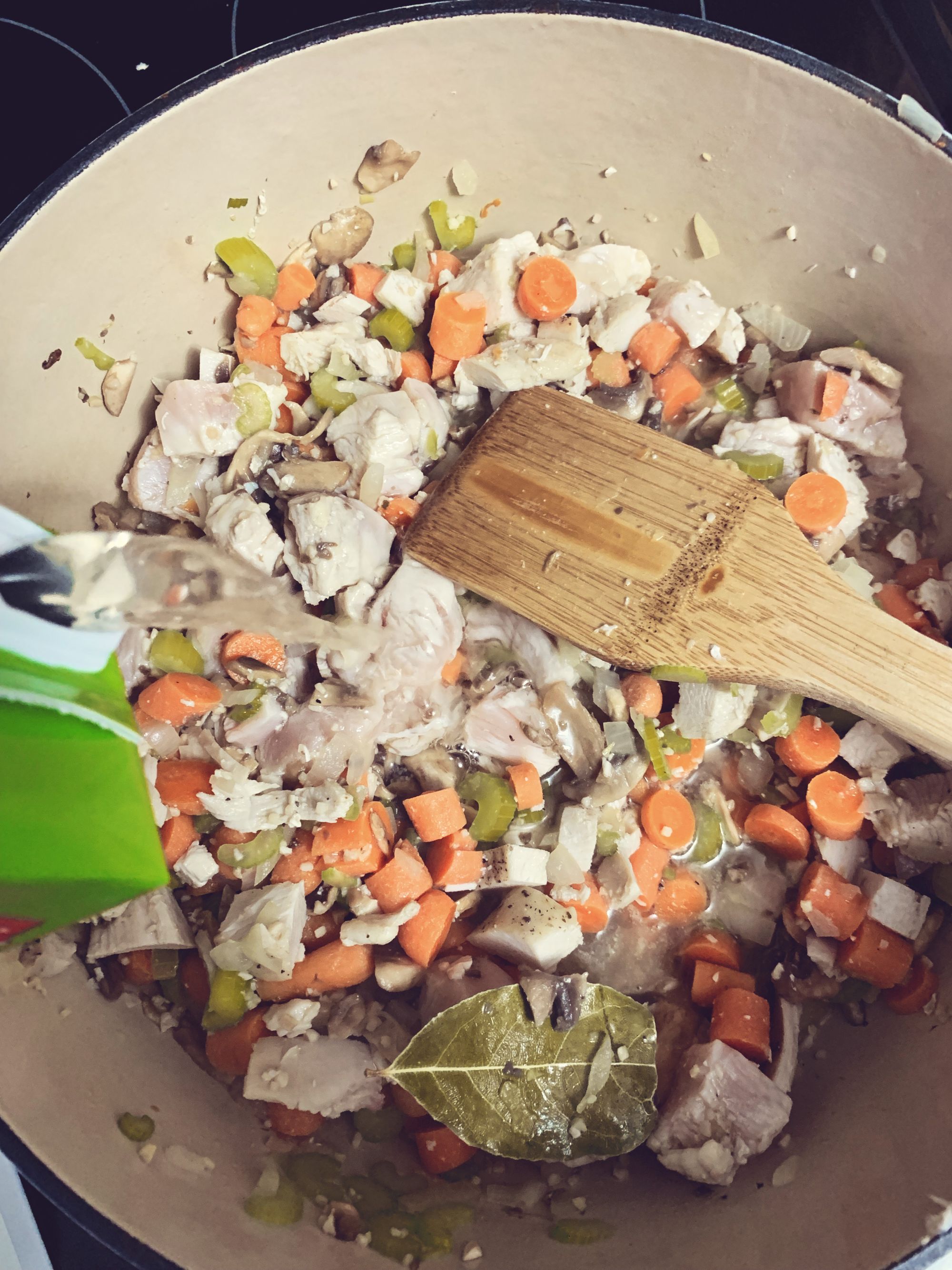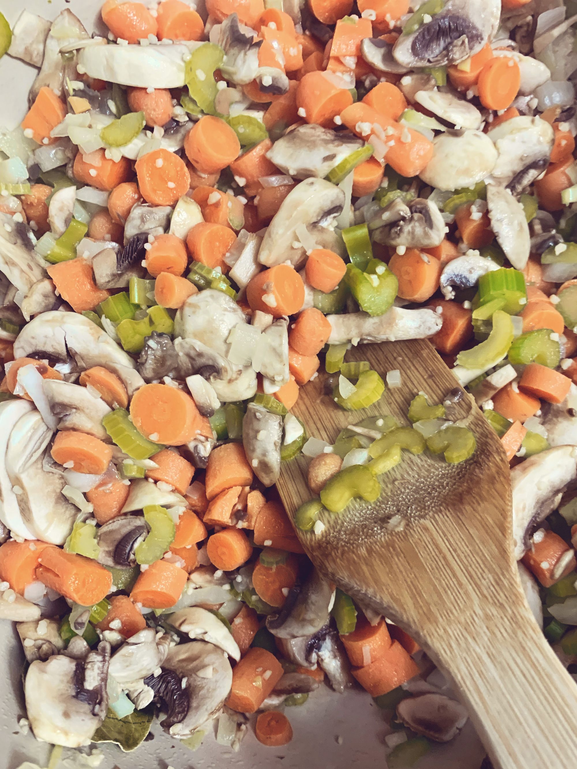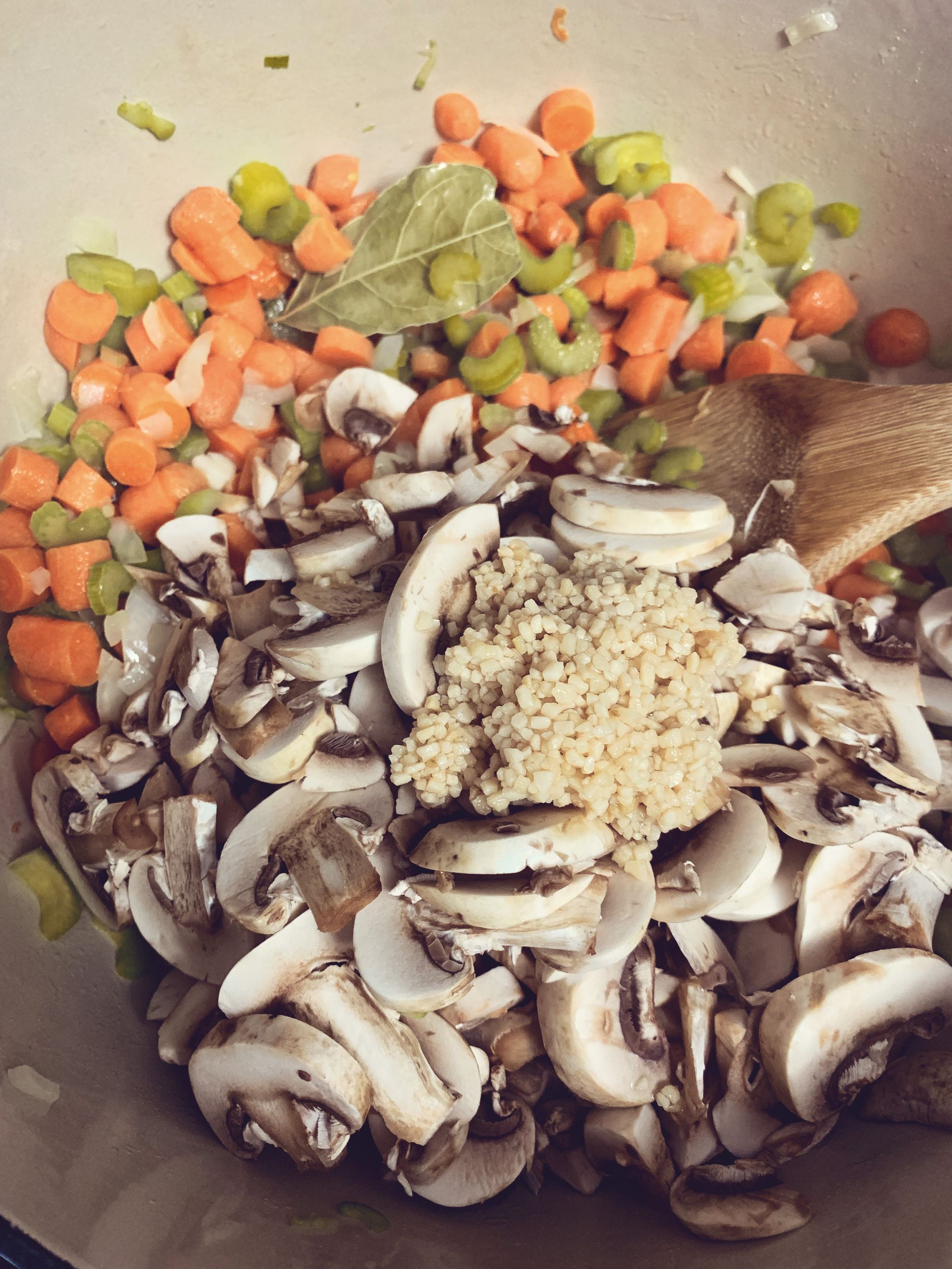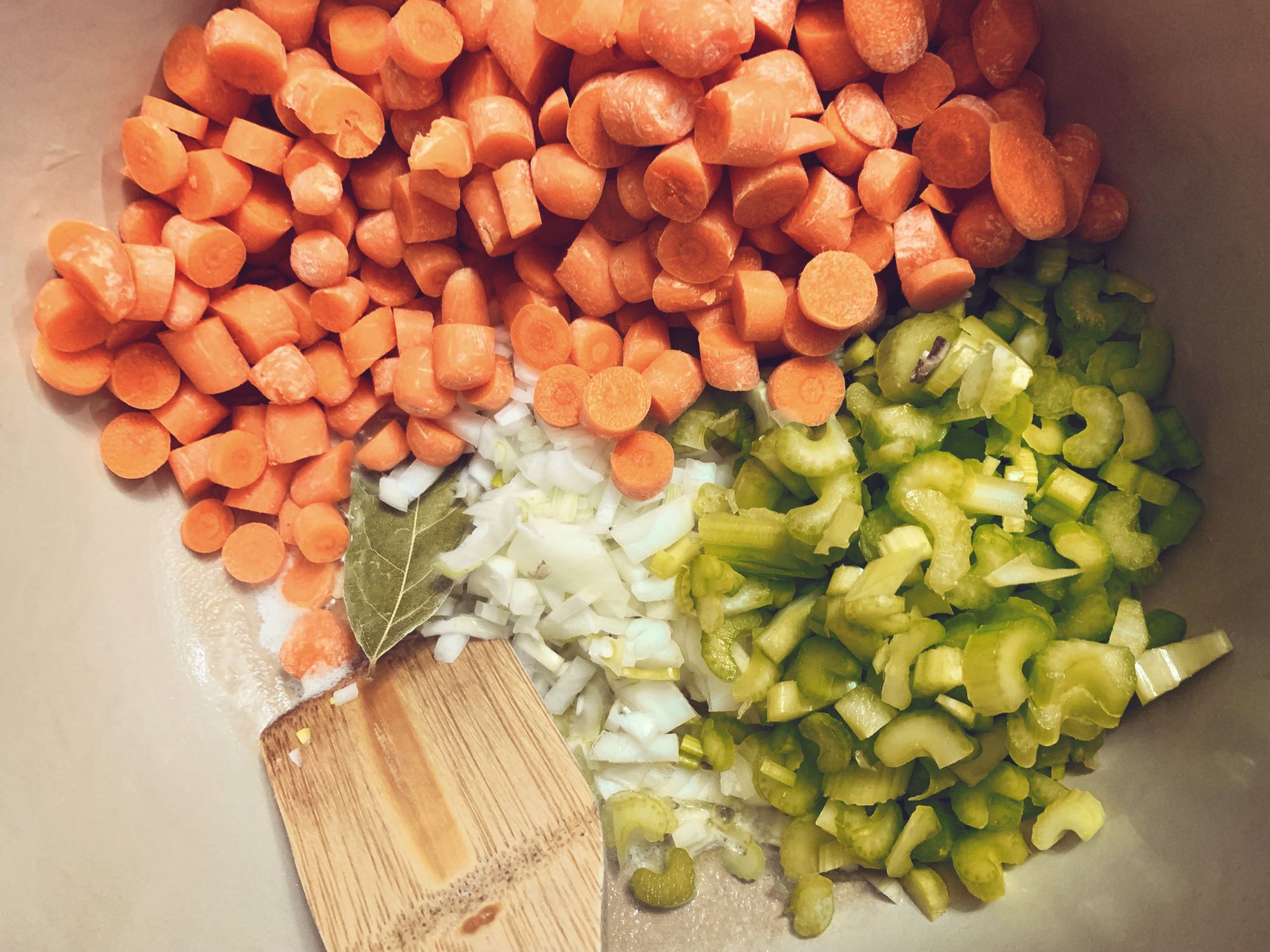 Step 2 - Toss your onion, carrots, celery and bay leaf in over the butter and stir occasionally until they begin to soften.