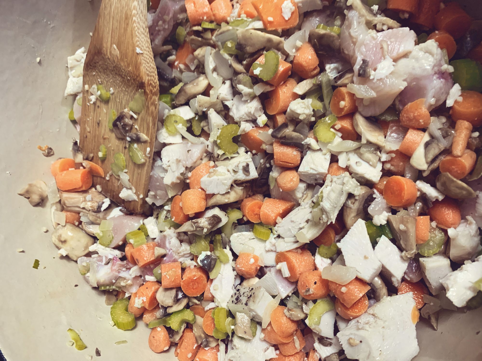Step 4 - Now add your raw chicken, or if you prefer, you can use pre-cooked. Cook, stirring occasionally until the chicken is no longer pink.