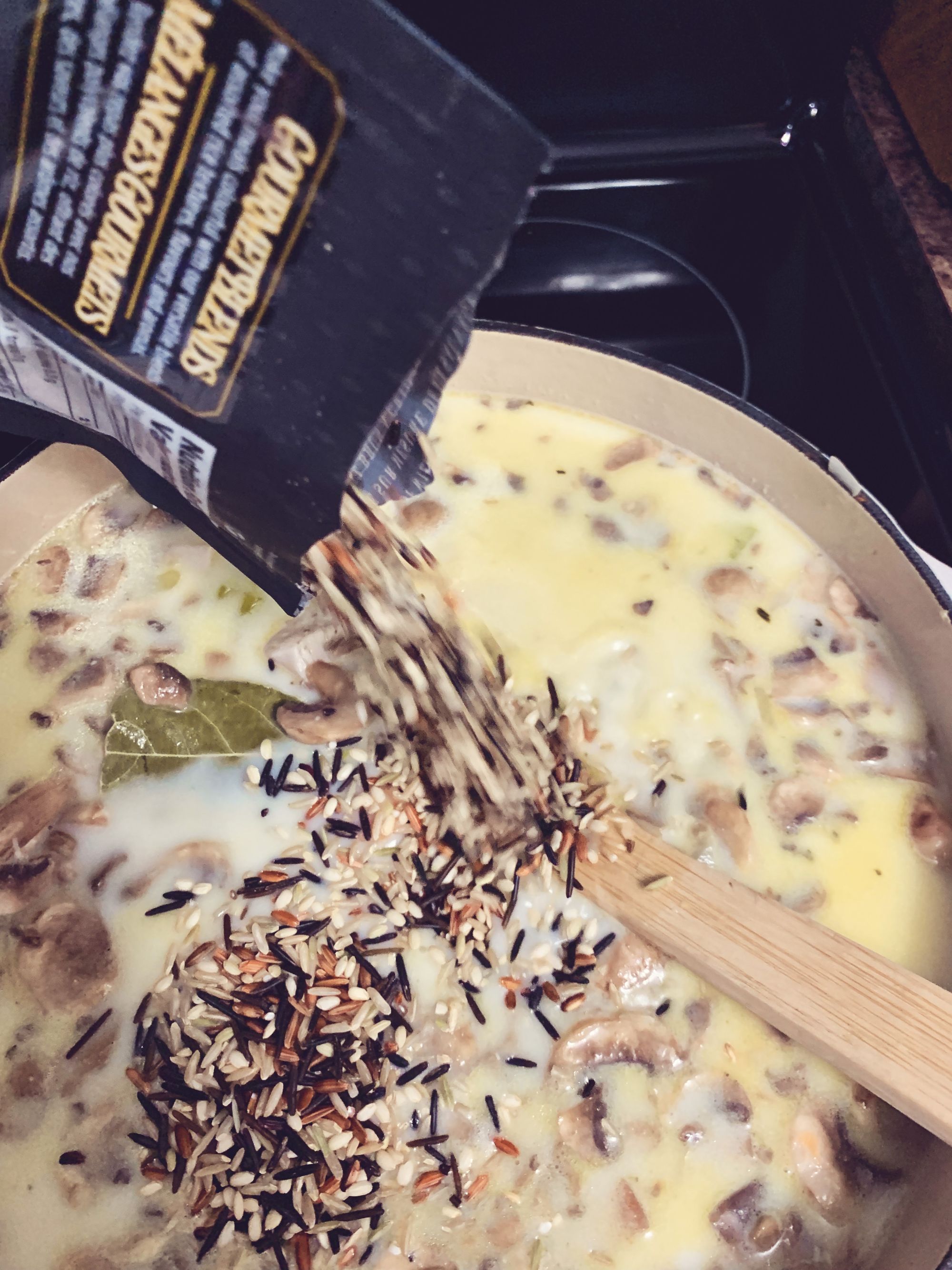 Step 5 - Pour in your wild rice mix. Stir to combine and put your oven temperature at medium heat and stir occasionally as it comes back to a simmer.