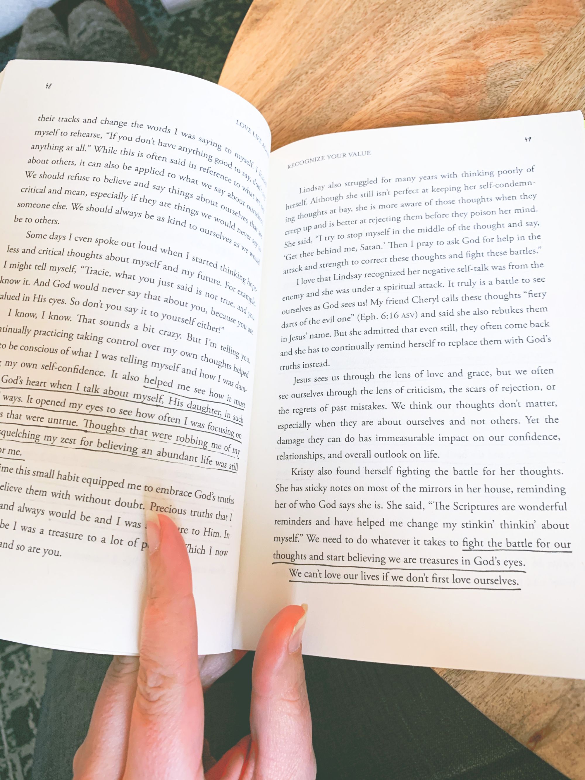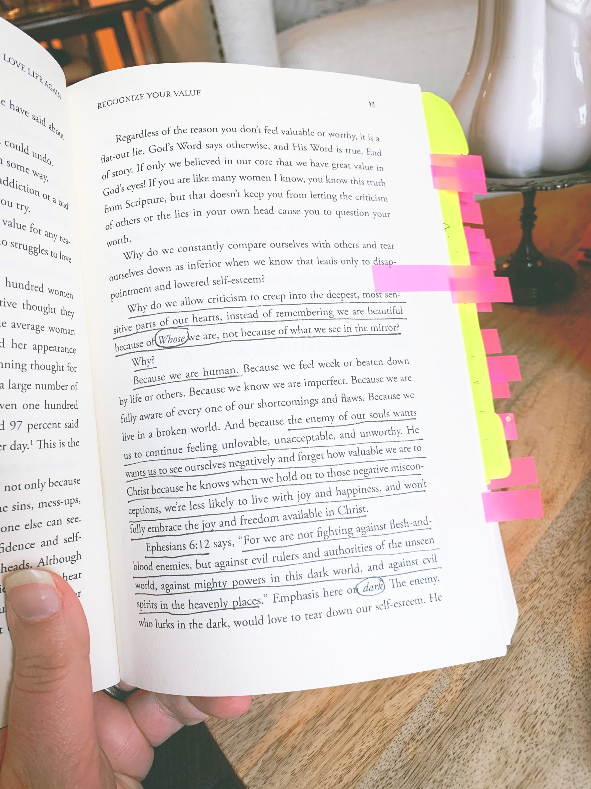 And that brings me to another hard thing taught in one of Tracie's chapter's. To love one's self. "Rather than obsessing over who I wasn't, which is what I had been doing for years, I began to ponder who I really was. I had felt unimportant and like I didn't measure up for so long that it took awhile to rediscover my value and start liking and accepting who God had created me to be ". Sound familiar? Those are Tracie's words, but they are also my story. Over and over again I connected with the words she wrote of her life and her story. Hearing my own echo in them. I have seen the light, that to believe I am worth love and such, I NEED to love myself first. And my starting point for that is to know that God loves me, created me and has saved me, all because I. Am. Worth. Something.