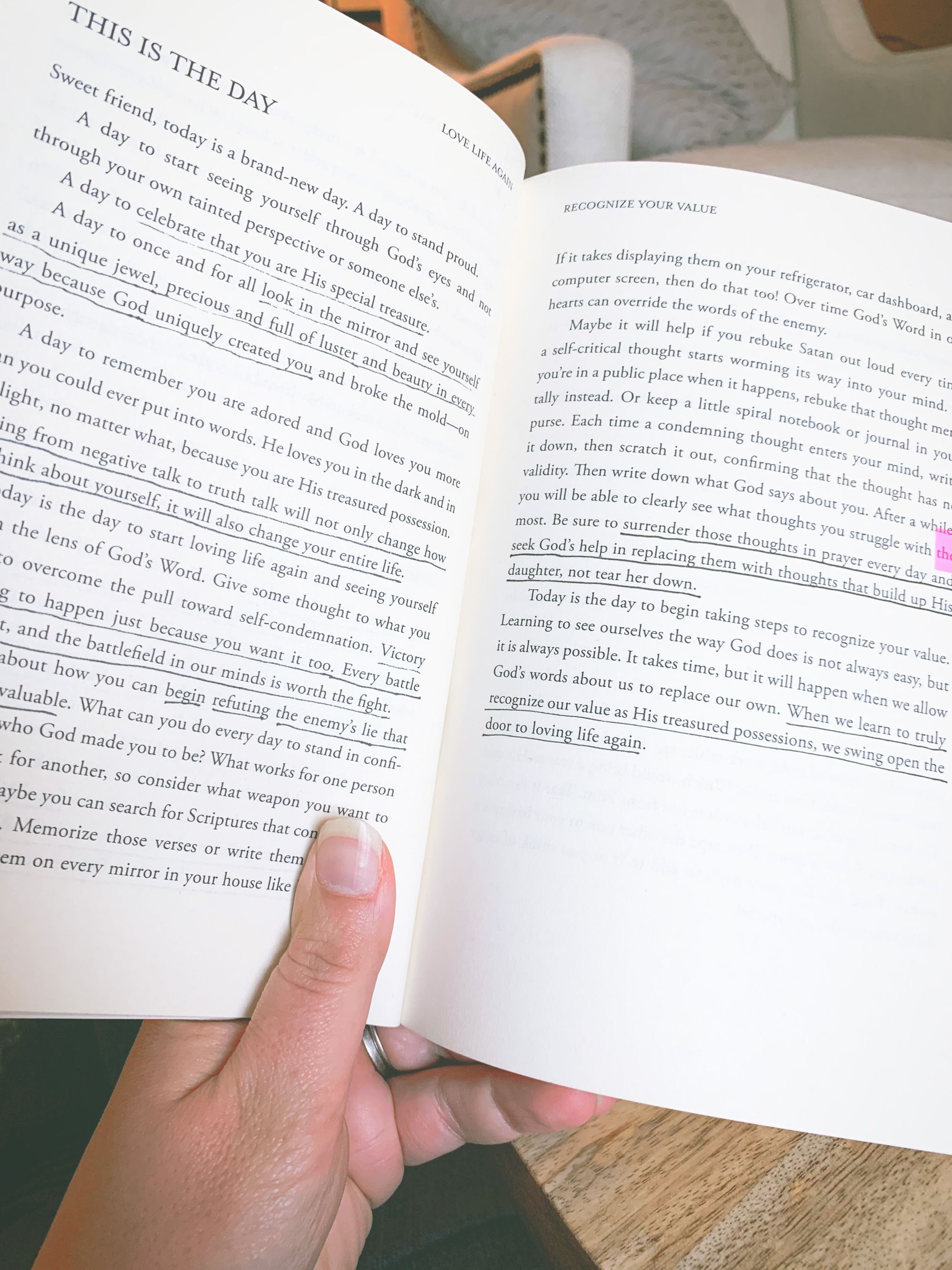 This book has given me tools, simple, black and white, plain as day challenges to push forward and fight for myself again. God never stopped fighting for me...Which is why I am still here. But I stopped fighting for me. I stopped believing in myself. I stopped loving myself.