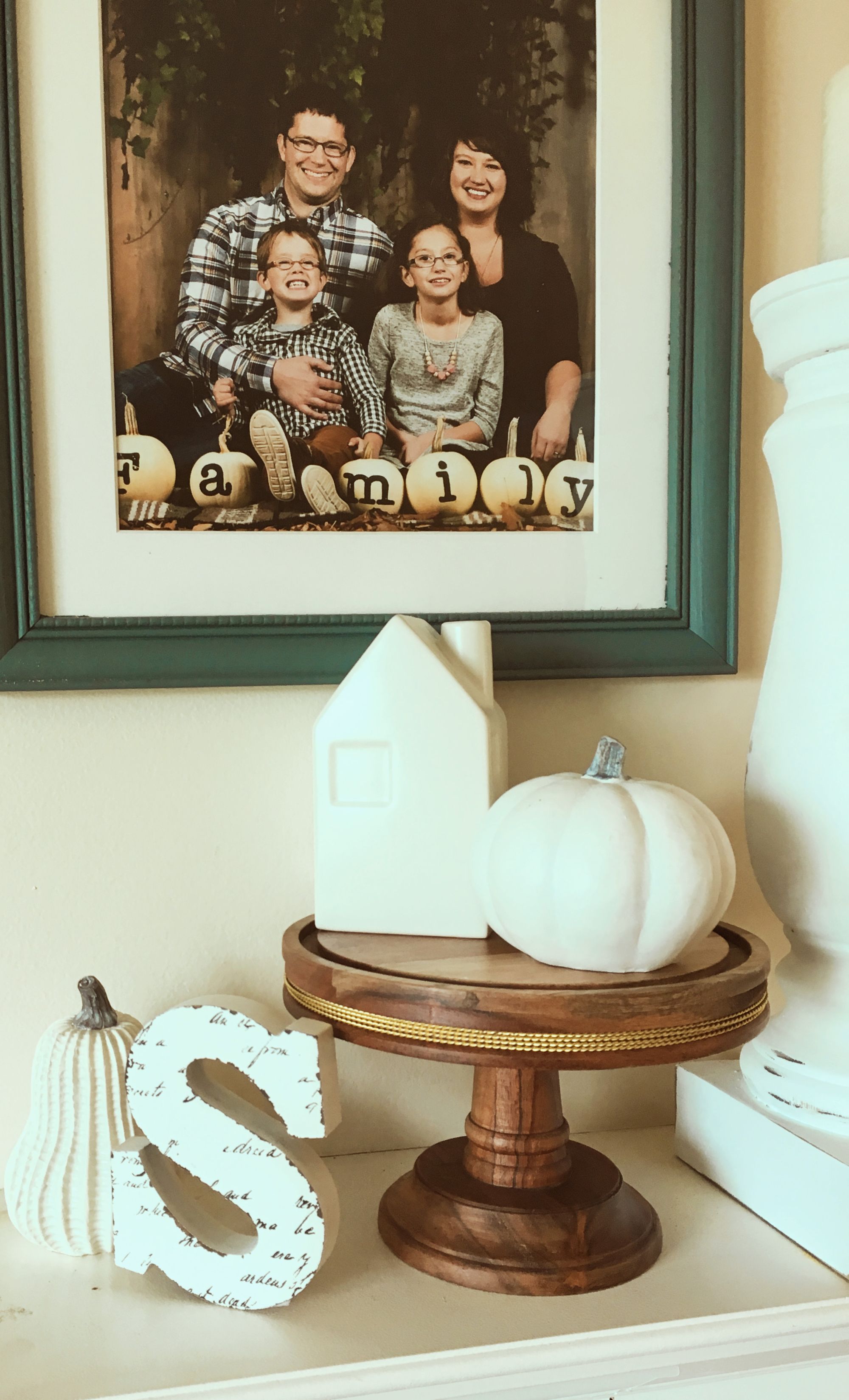 - Fall Family Pictures. Every fall we attend a local farm's Pumpkin Festival. They always have a photographer set up a booth there and we always make it a priority to book into their sessions. This is a bit more financially, but we find it worth saving a little aside to ensure we are all in a family photo set together once or twice a year. I will have these printed ASAP and put them in the frames I have set out specifically to show the latest in our family pictures. I have two spaces I like to do this. A set of two frames over the mantel in our living room, which I will show the previous spring session and that recent fall photo, and a multi frame about our buffet that will be filled with all my favorites from the session.