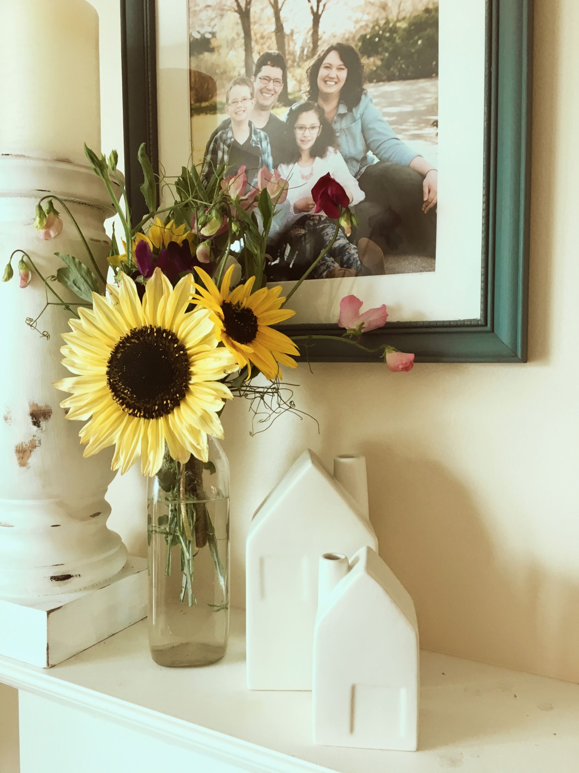 - Fresh Flowers that are seasonally available. My sunflowers were amazing for the first time ever this year and have been an endless supply of joy and color in our house. So run to the grocery store if you haven't got your own and grab a bunch! I find them for as little as $3.99 for 3-5 flowers and thats more than enough to create a bold splash of Fall in any room.