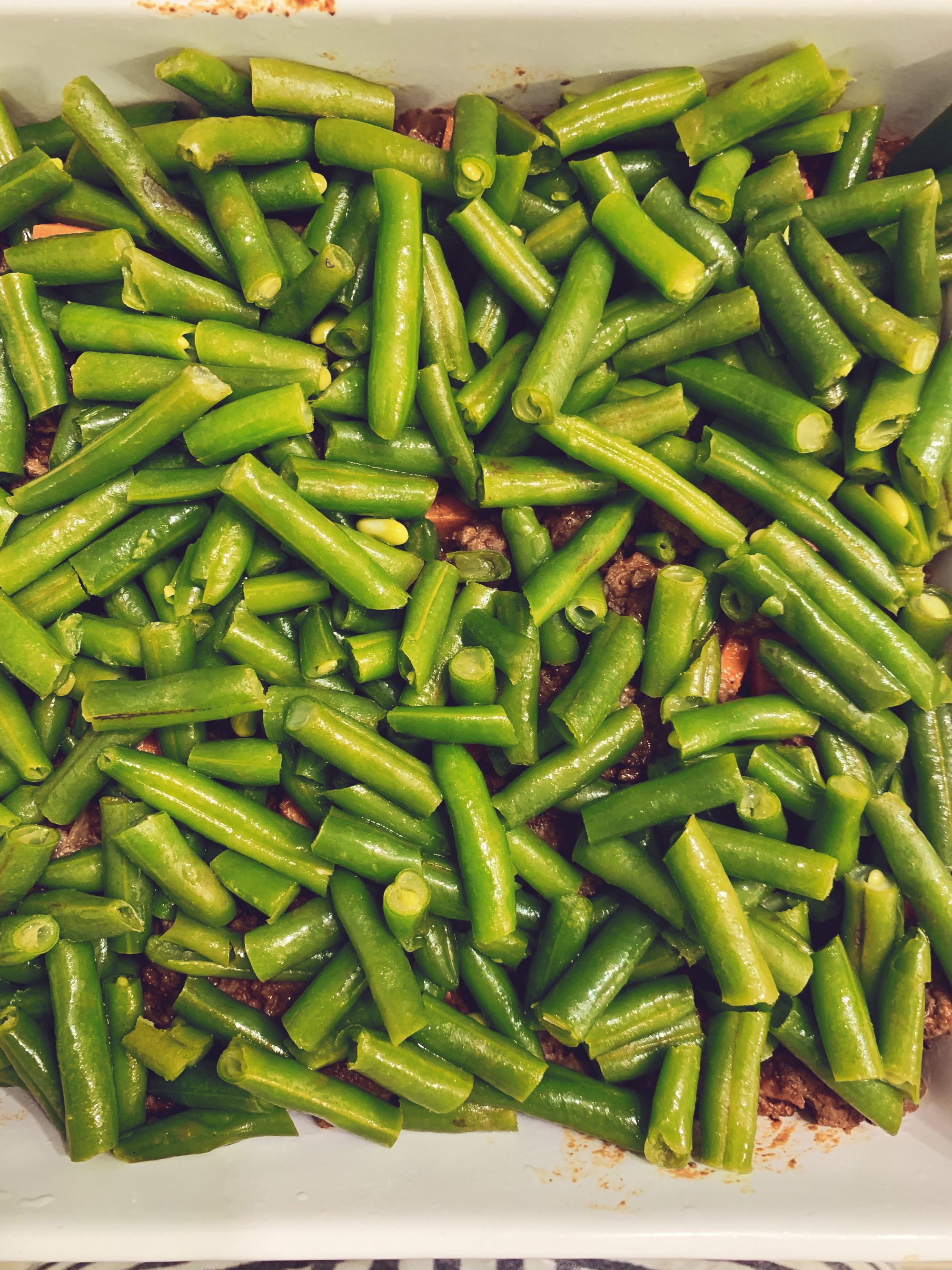 Step 8: Now to finish assembling the Shepherds Pie. Place the sliced green beens in a layer over your beef mixture.