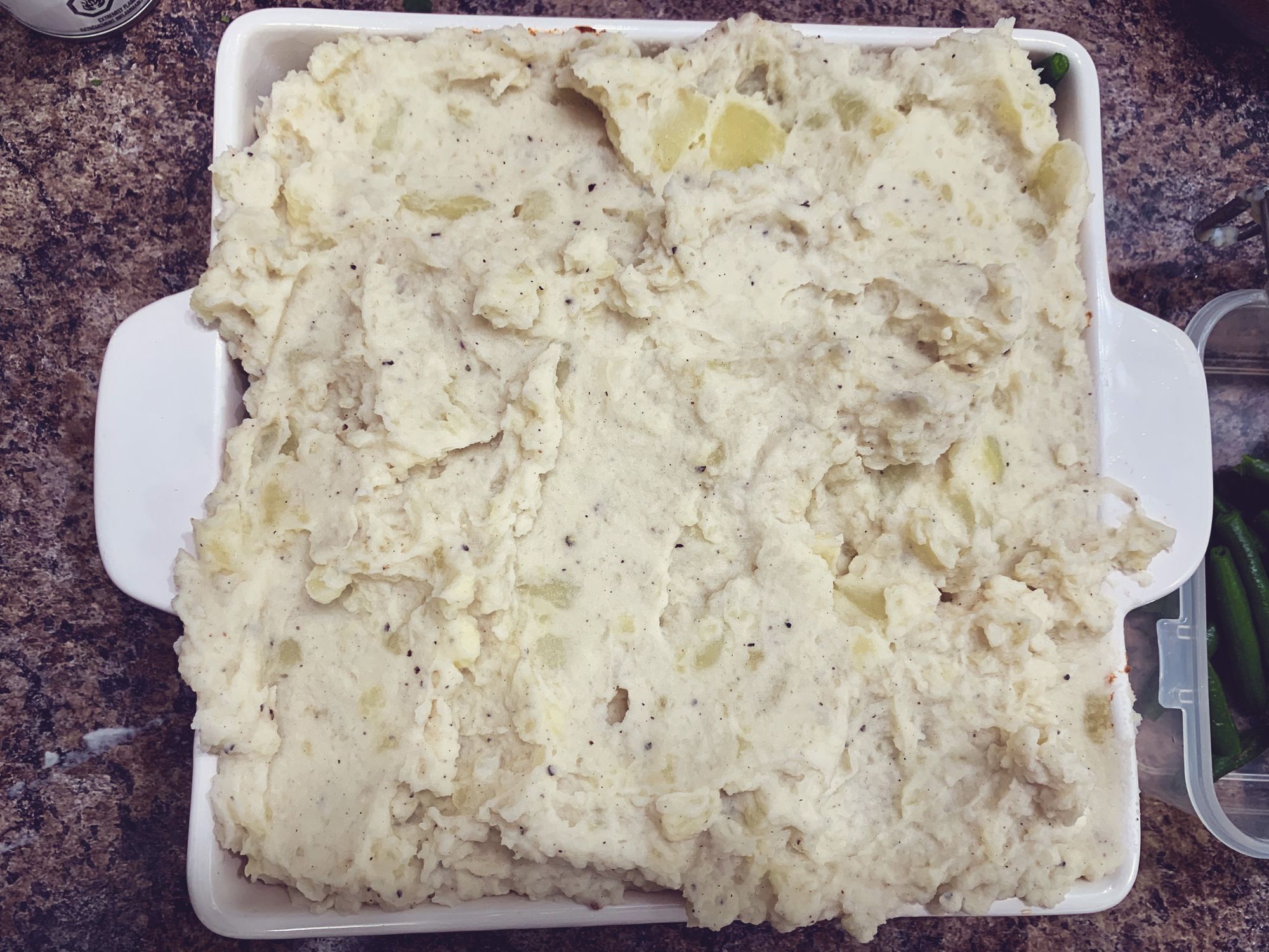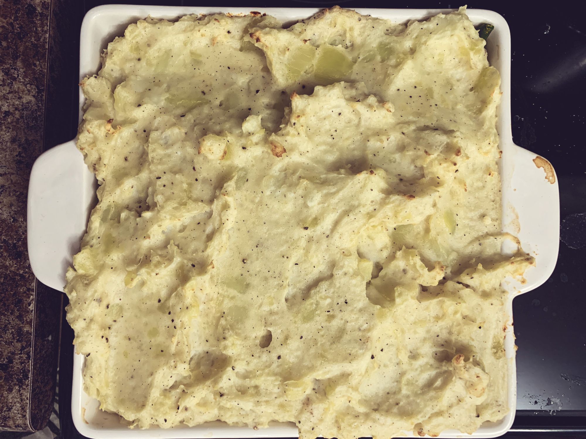 Step 9: Top with those glorious mashed potatoes. And pop it into the oven!