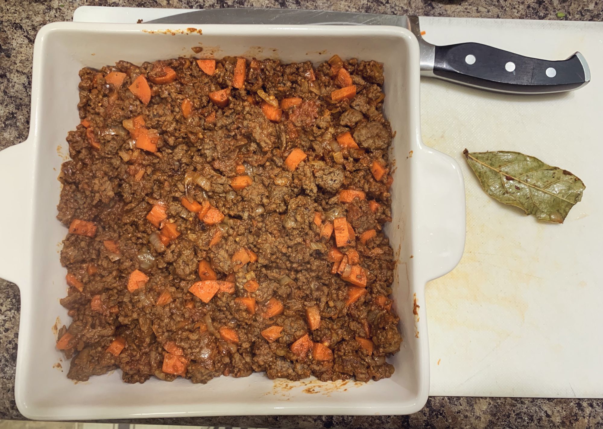 Step 6: When the meat mixture is nice and heated through, scoop it into an oil sprayed, deep casserole dish. Remove the bay leaf. Now it's time to preheat your oven temp to 375*F.