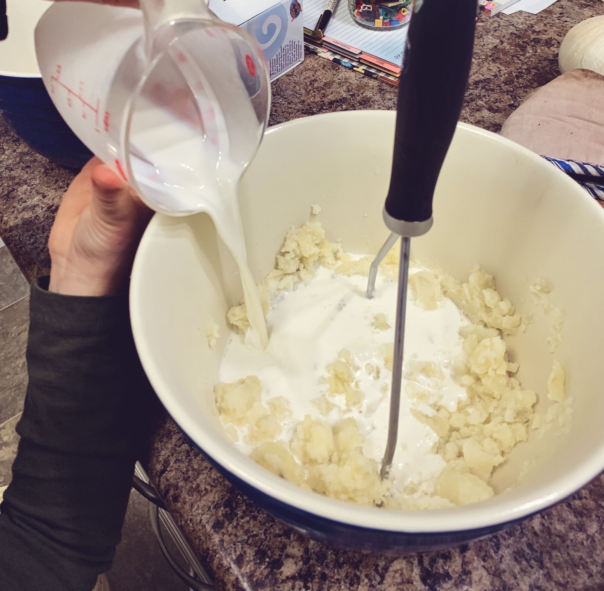 Step 7: Time for the mashed taters! Once your potatoes have boiled and cooked for about 20 minutes. begin to check them. If you can pierce them with a fork and they begin to fall apart they are ready! Strain them and dump into a large mixing bowl. Begin to mash them up a bit and then toss in your butter. After you butter is melted and nicely incorporated add your cream, milk and nutmeg. Continue to mash until all is well mixed.