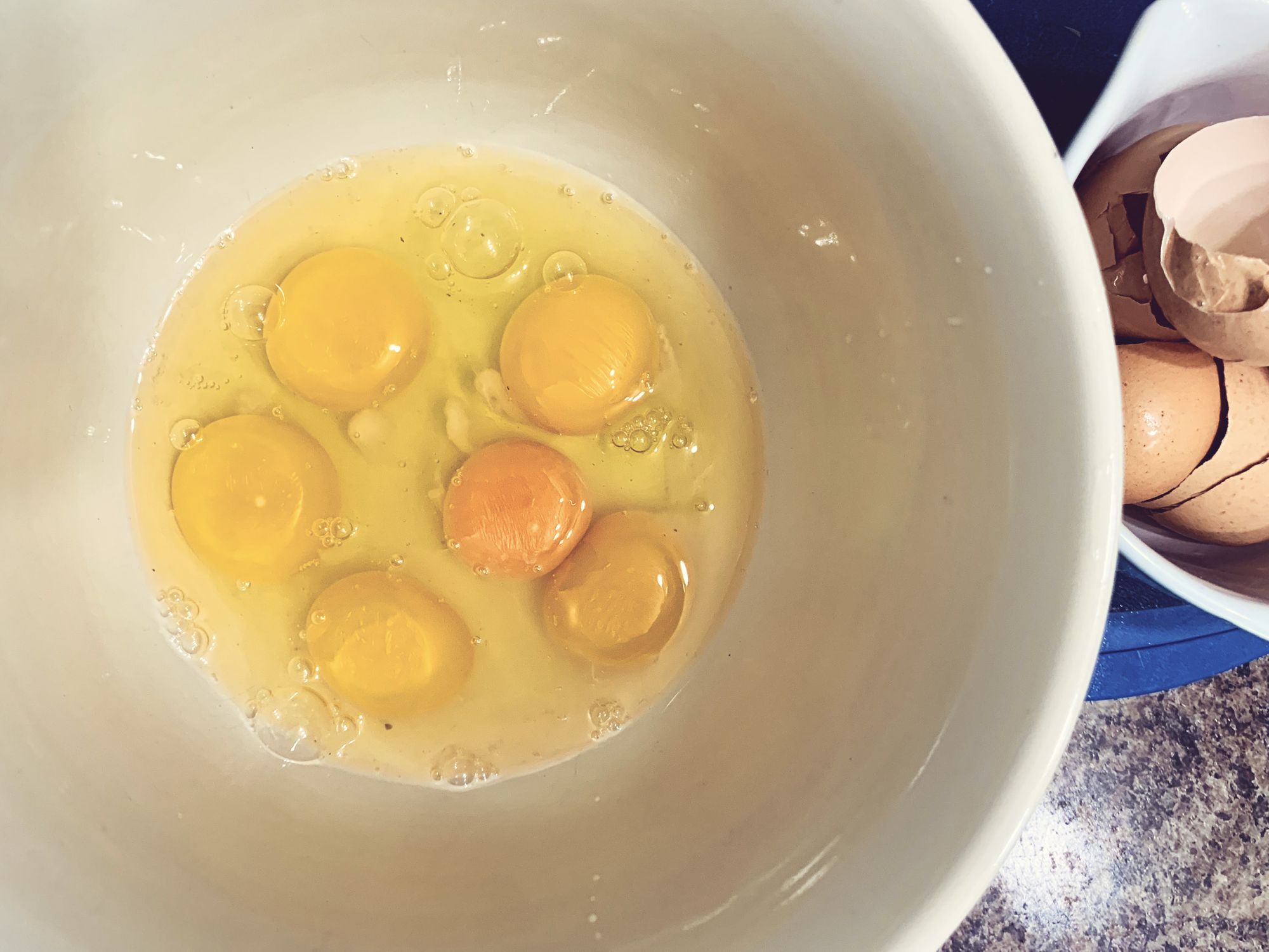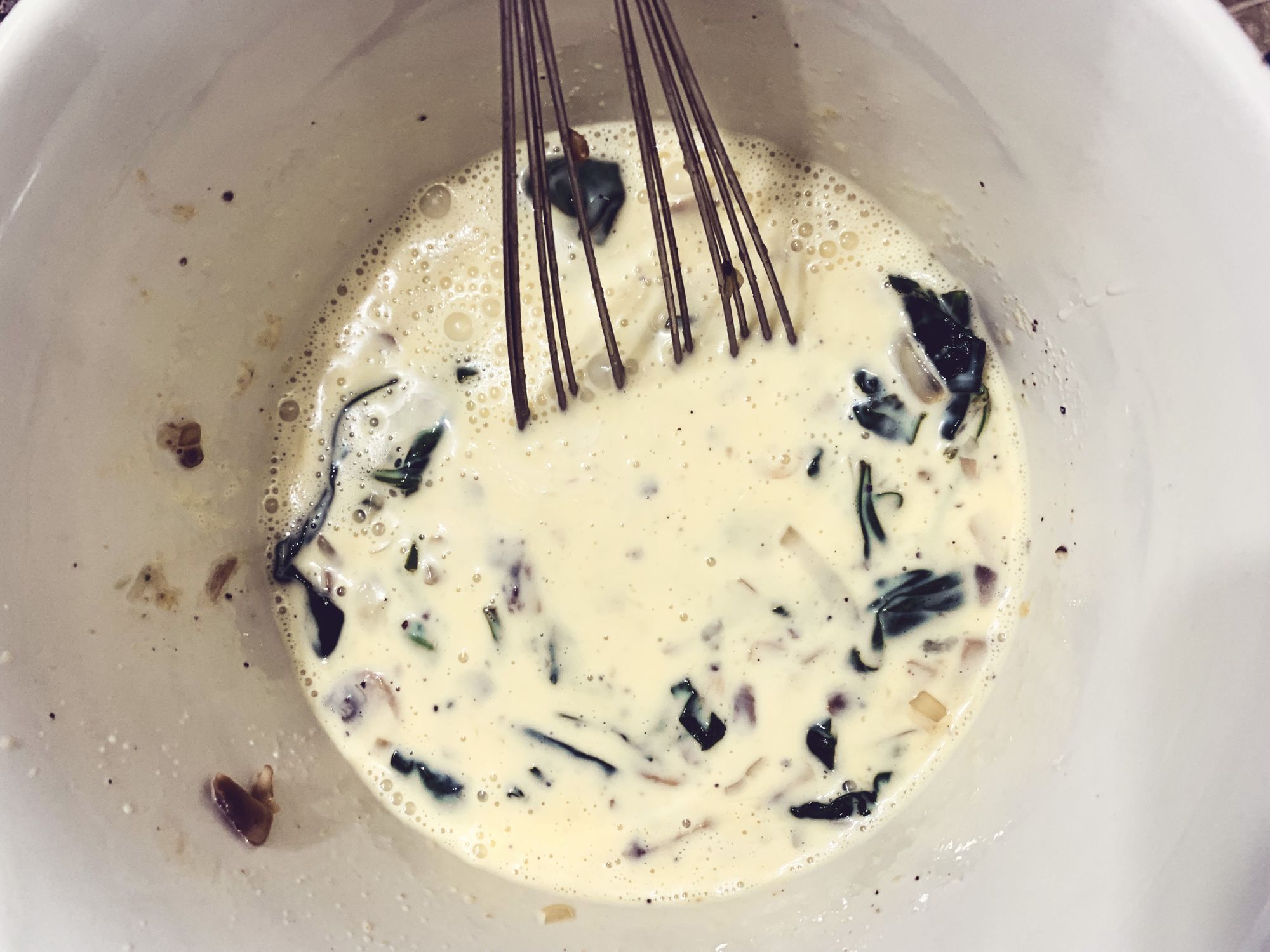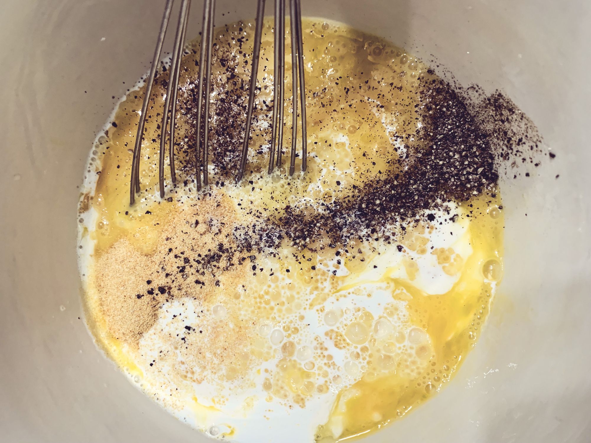 Step 3: Break your eggs into a large mixing bowl. Whisk and then add your cream, salt, pepper and garlic powder (if using- don't double up on the garlic). Whisk together.