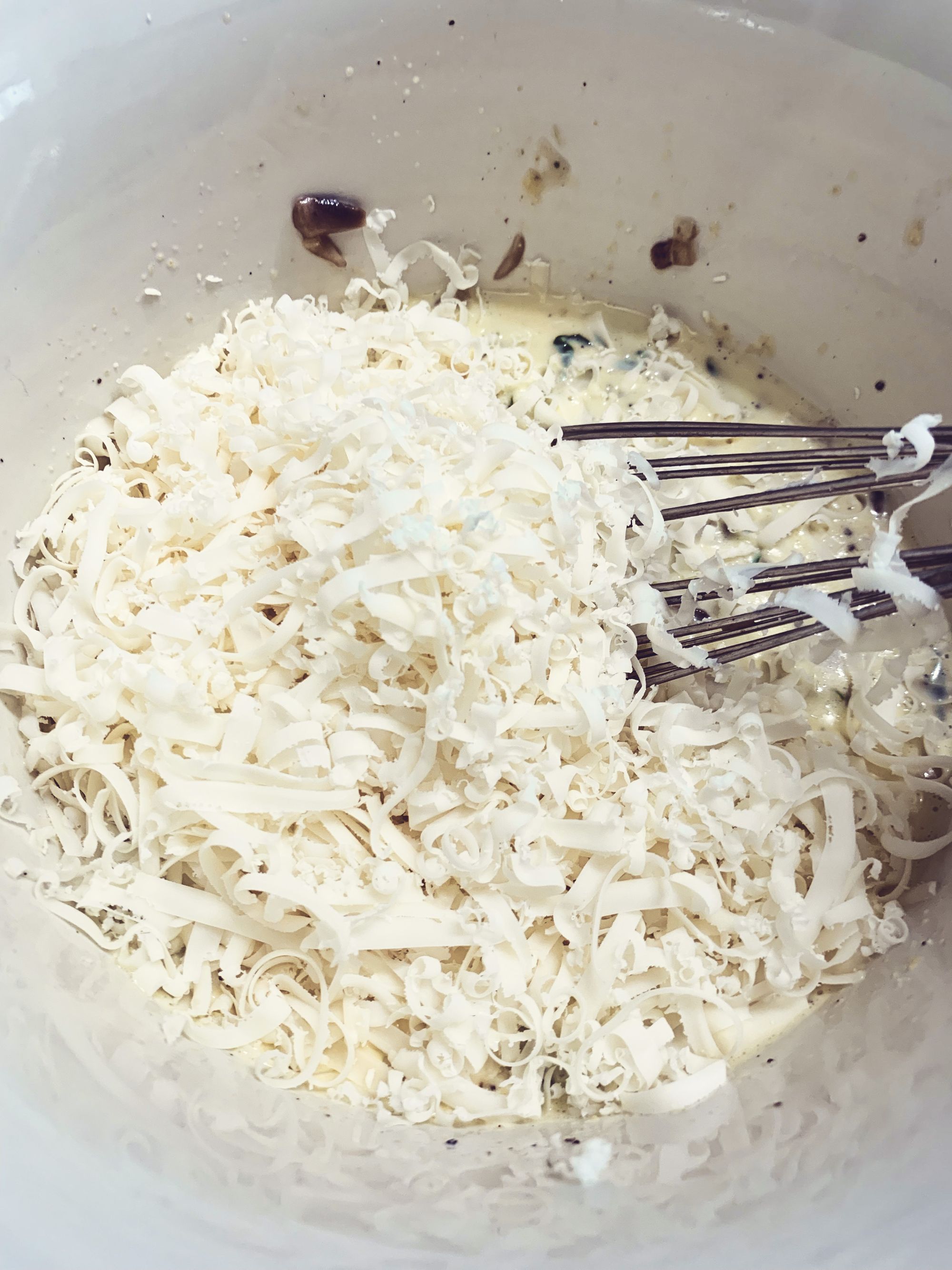 Step 4: Add your cooked and now cooled veggie mixture. And then add your grated swiss cheese. Stir well to combine.