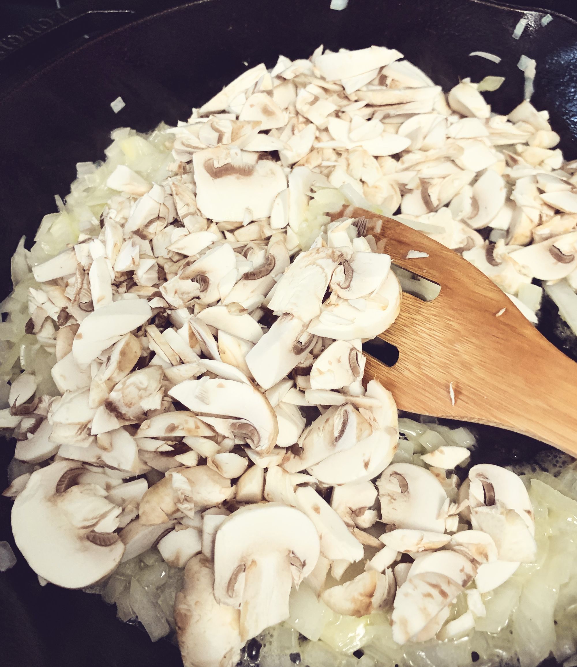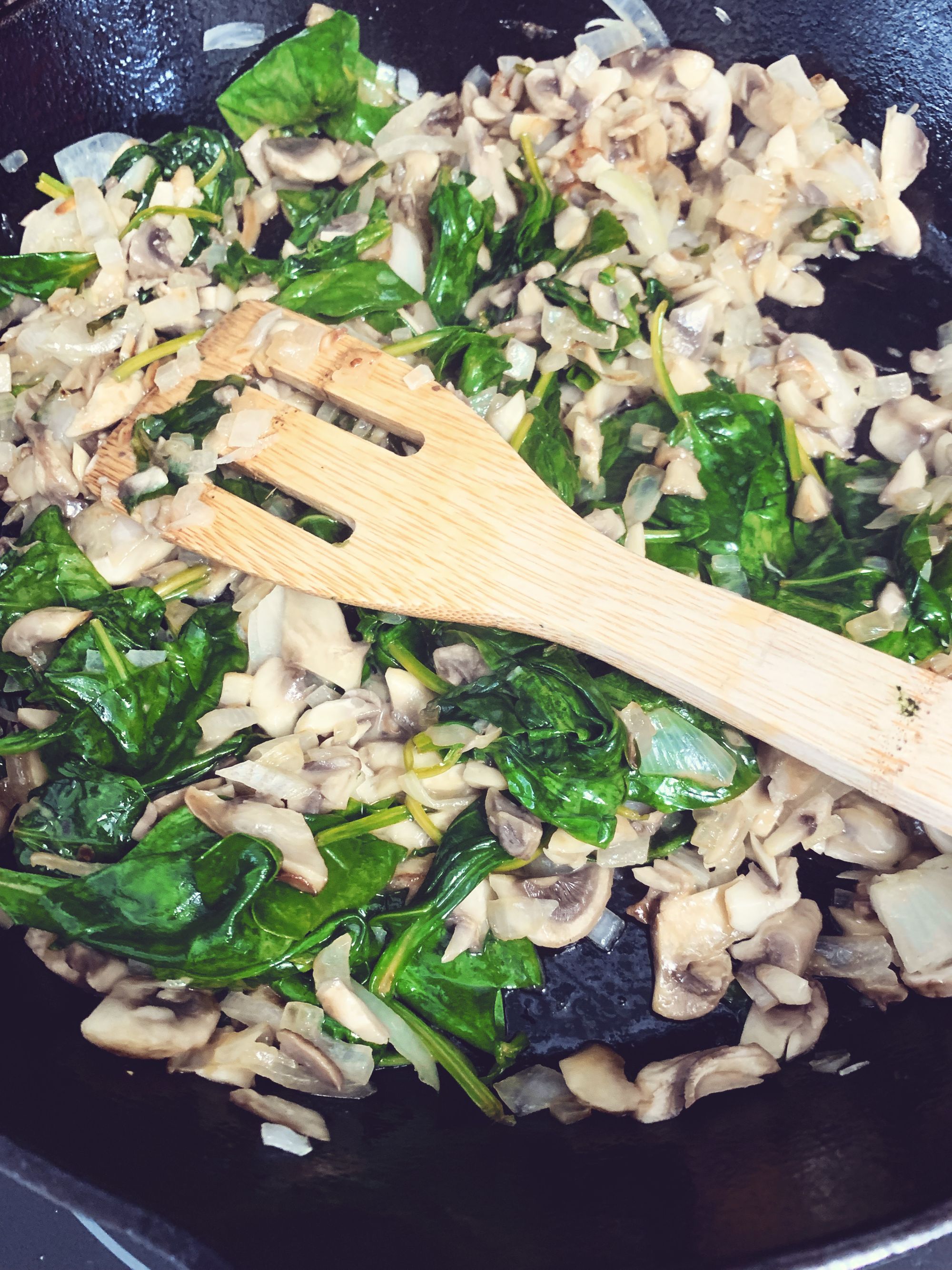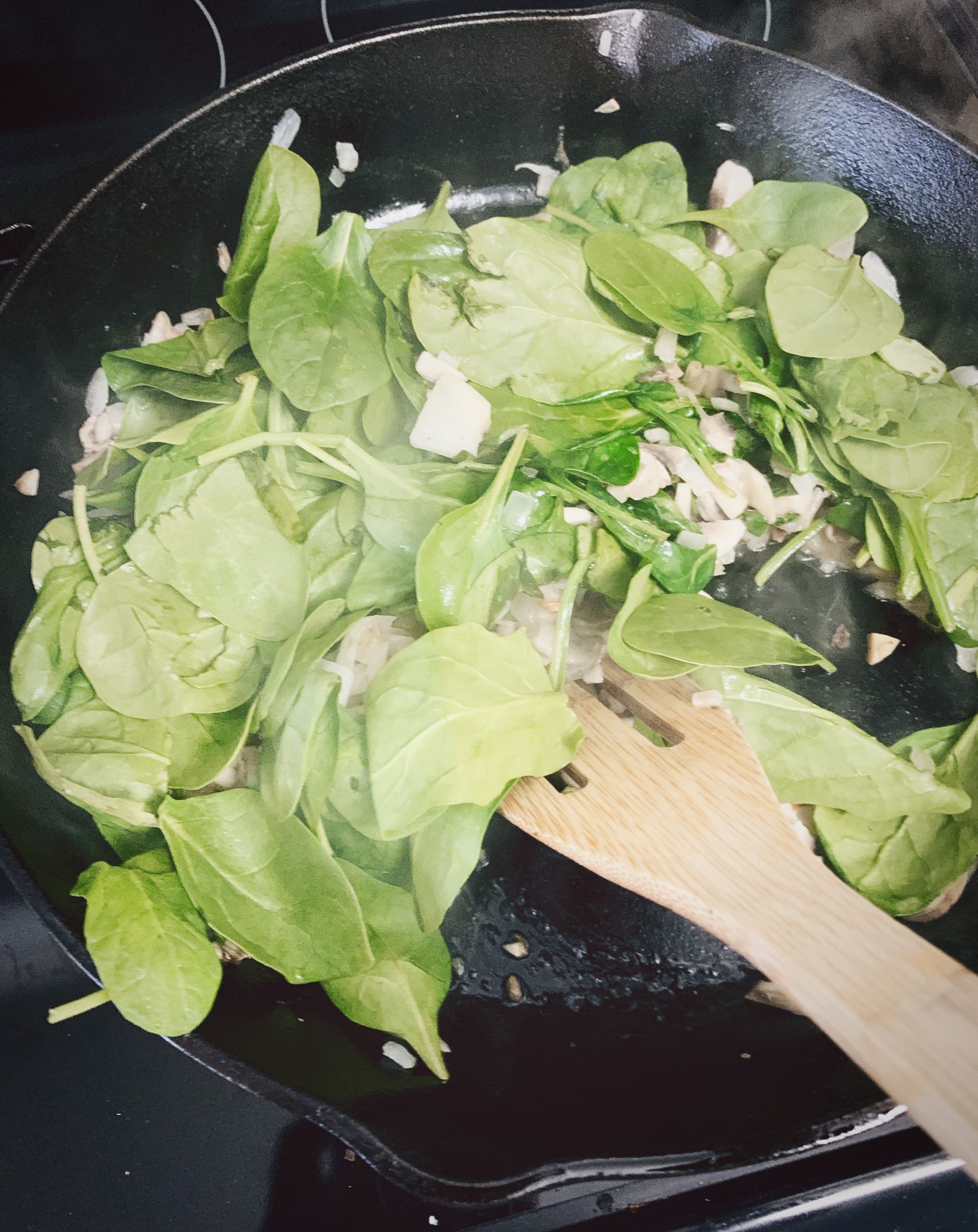 Step 2: Add your mushrooms and cook down, occasionally stirring, until most of the moisture has cooked off, about 3-5 minutes. Add your spinach and allow it to cook down for about a minute, stirring constantly. Set aside.