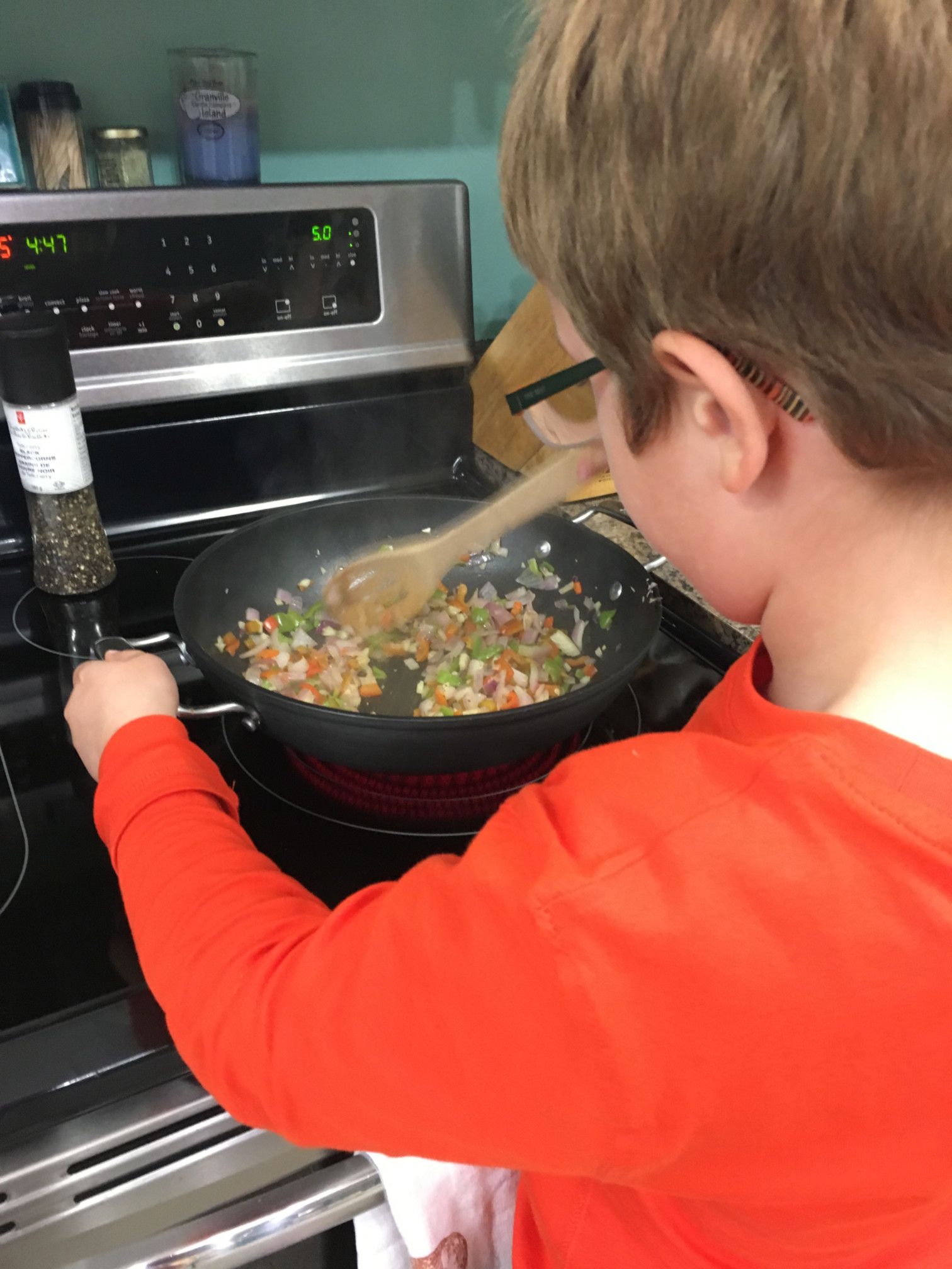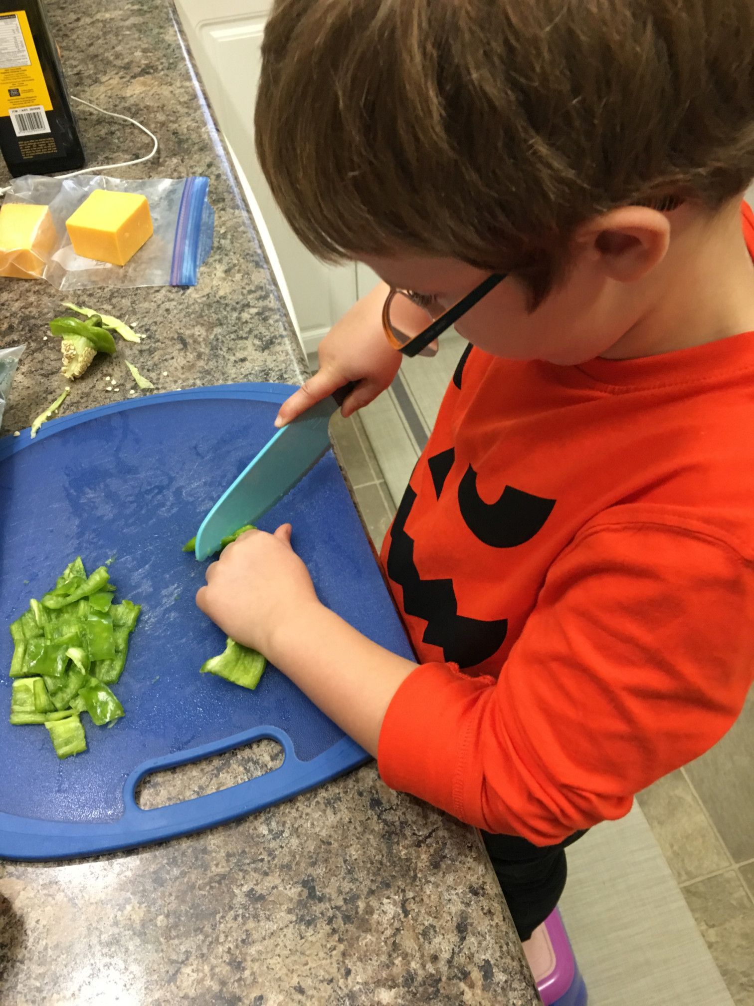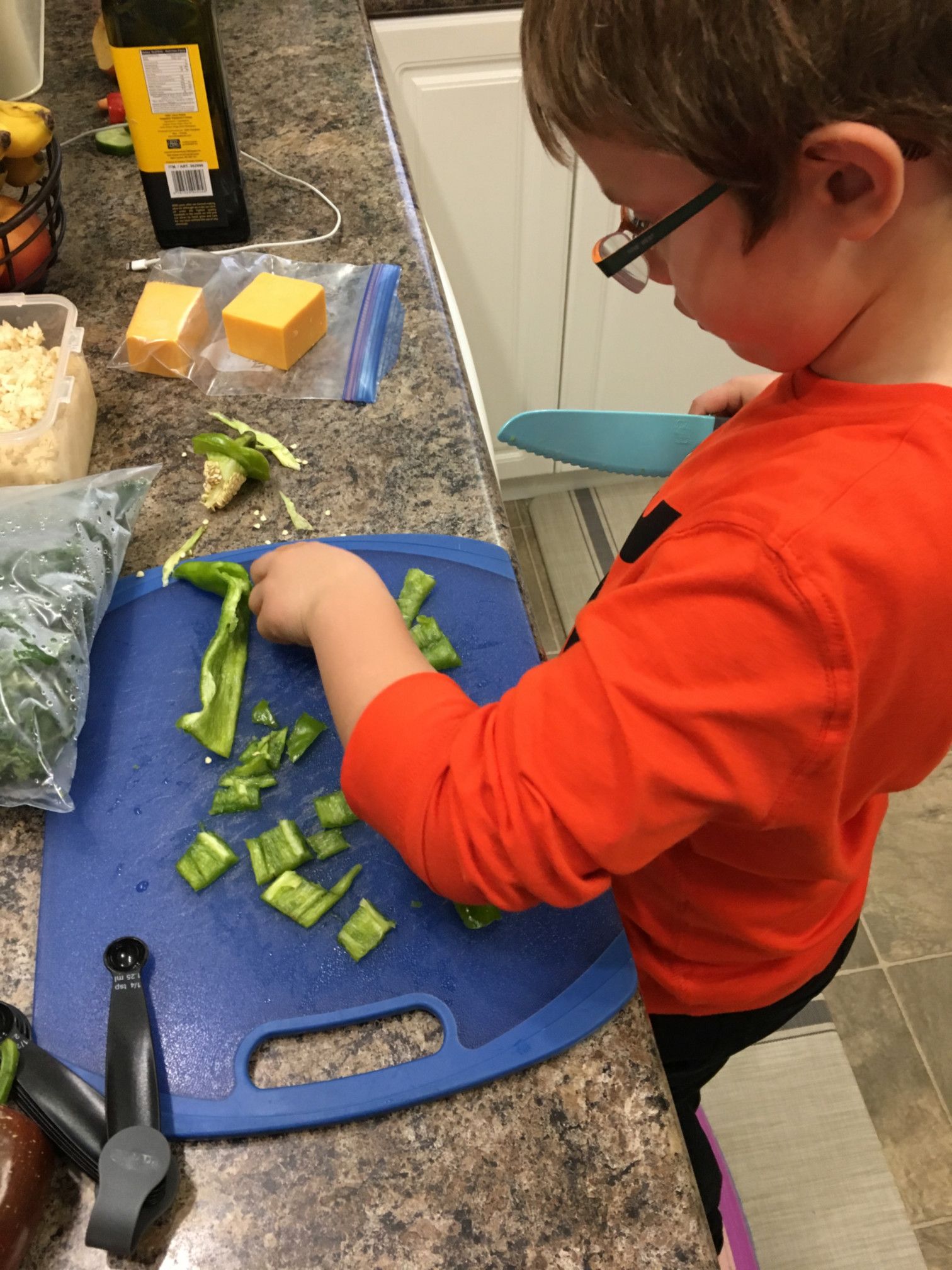 Step Three- Prep all your veggies. The peppers were easy for this little man to cut into pieces and then I chopped smaller with mine. Then it's time to heat your wok over medium-high.