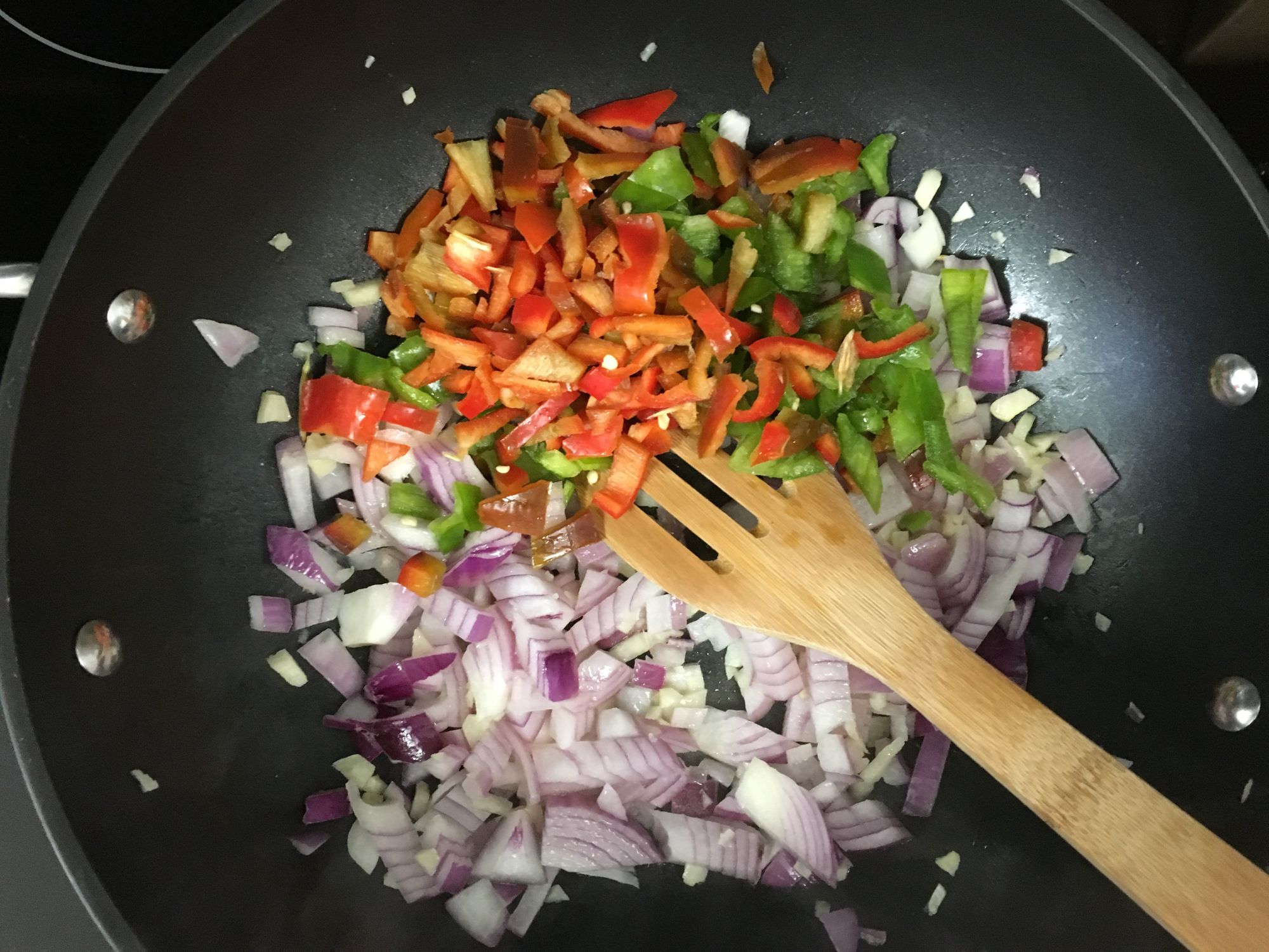 Step Four- Add garlic, onion, peppers and your seasoning mixture. Then stir.
