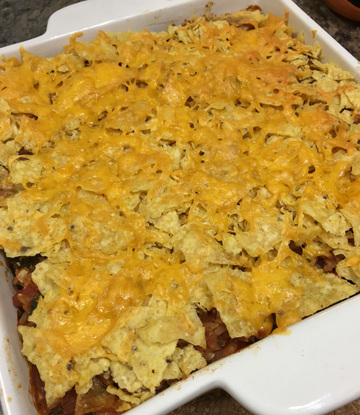 Step Eight- Top the chips with the remaining shredded cheddar cheese. (Add more if needed ;-) Then tent the top with tinfoil and pop into the preheated oven. Bake for about 30 minutes. You are just trying to heat it thoroughly. So if it stays in longer it will be fine too.