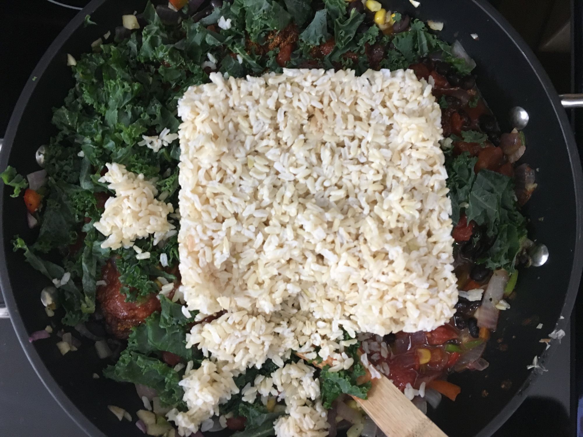 Step 5- Next Add the remaining ingredients: corn, diced tomatoes, tomato sauce, chopped kale, black beans, rice, and stir. Then stir in a quarter cup of the shredded cheese.