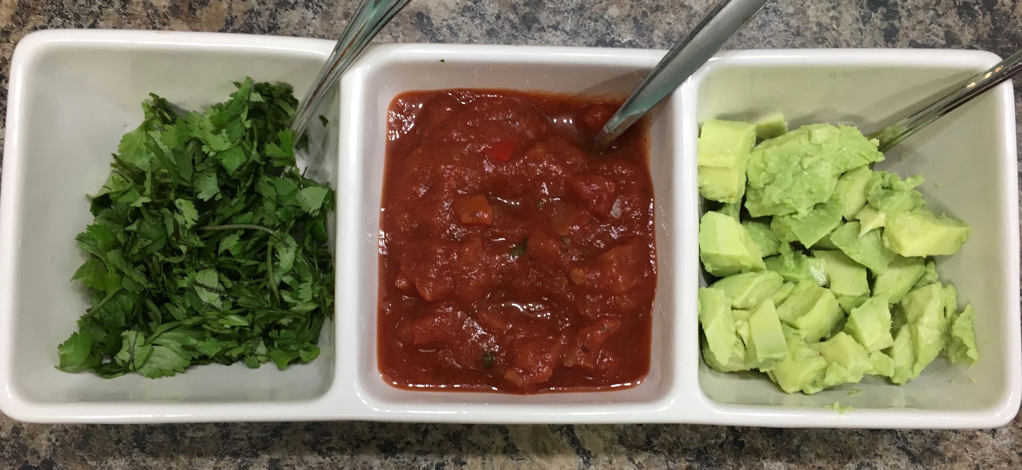 Step Nine- While it bakes, prepare your toppings! We love chopped cilantro with any Mexican food. Then some salsa, cut up avocado and sour cream (not pictured) are a must for us! You could also serve with more tortilla chips, extra cheese, olives, jalapeños- anything you could see as a topping on nachos!